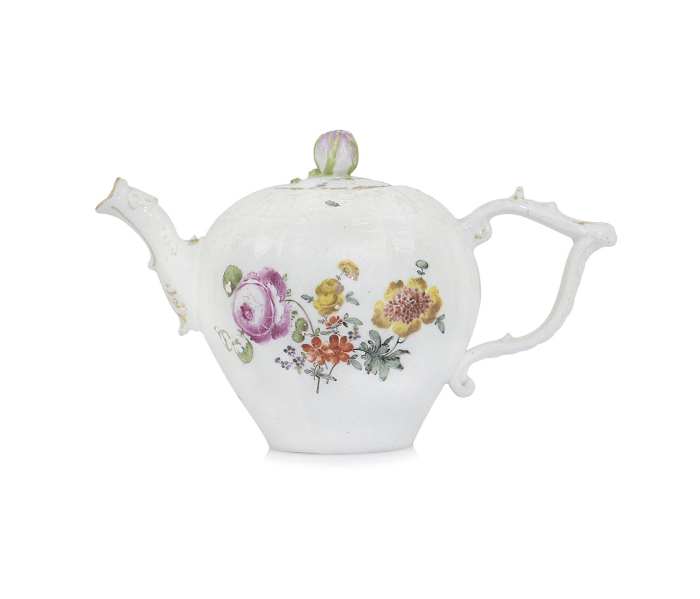 TEIERA IN PORCELLANA, MEISSEN, 1750 CA., globulare costolata con decoro floreale policromo.