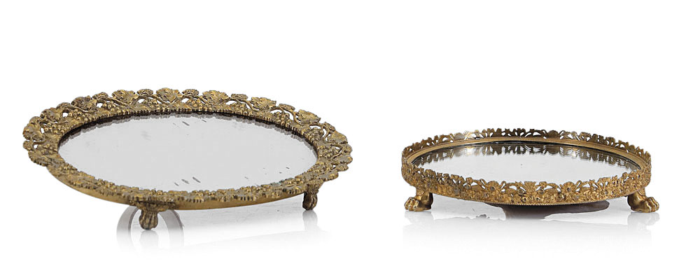DUE SOURTOUT DE TABLE IN BRONZO DORATO IN STILE IMPERO, XIX SECOLO, piani a specchio, piedi ferini, uno circolare con ringhierina traforata e uno ovale con bordo a grappoli d'uva.