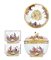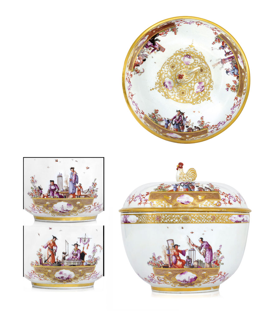 RARA ED IMPORTANTE ZUPPIERA CON COPERCHIO IN PORCELLANA DECORATA A CINESERIE, MEISSEN, BOTTEGA DI J.G.HOEROLDT, 1735 CA., gobulare con coperchio cimato da gallo, decoro policromo tripartito a vignette con figure cinesi su mensola in oro a squame e fiori indiani, al centro di ogni mensola e sul bordo a greca superiore riserve polilobate con scene di porto in porpora; estese dorature; restauro e usure minori alla doratura.