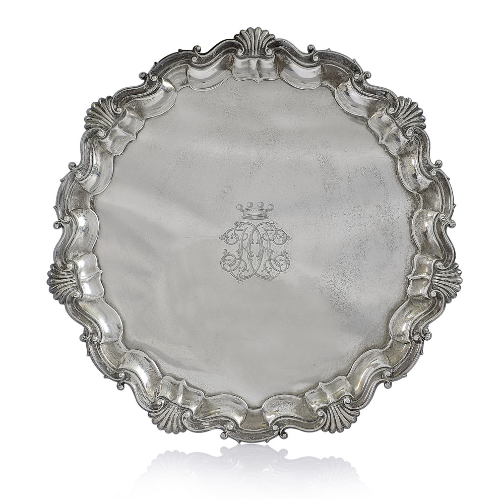 GRANDE SALVER IN ARGENTO, LONDRA, 1912, circolare su piedini con bordo a volute e monogramma coronato inciso.