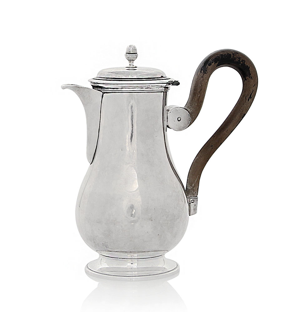 VERSATOIO IN ARGENTO, TORINO, XVIII SECOLO, piriforme liscia con manico in legno, cimatura a pigna.