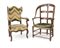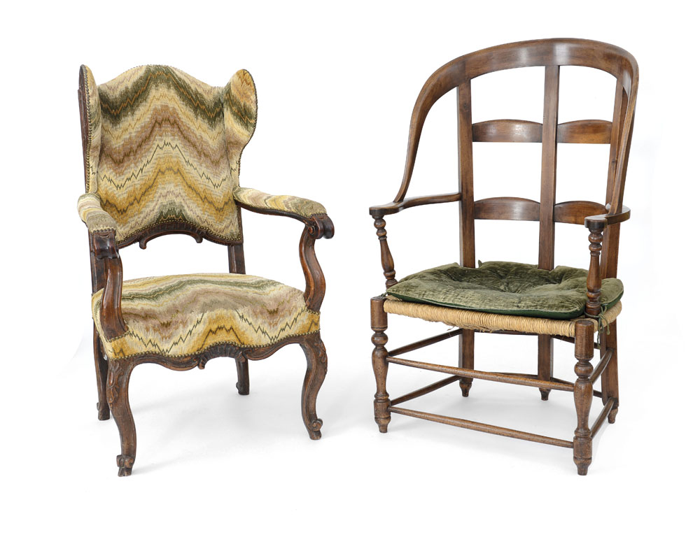 POLTRONA IN ROVERE CON ORECCHIE, XVIII SECOLO E POLTRONA IN NOCE A POZZETTO, XIX SECOLO, usure e difetti.