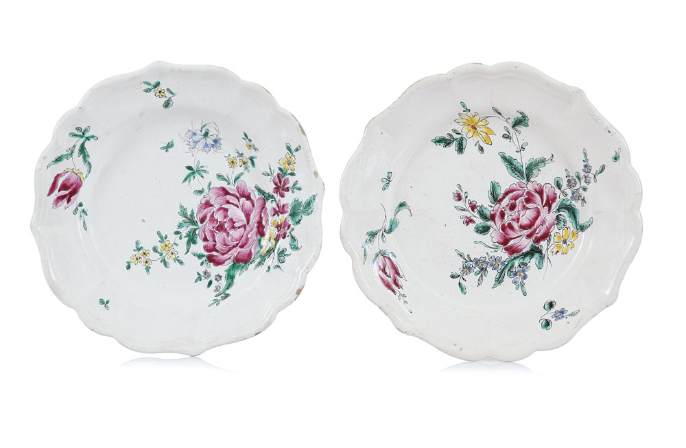 COPPIA DI PIATTI IN MAIOLICA, LODI, SECONDA META' DEL XVIII SECOLO, decoro policromo a mazzetti e fiori sparsi; lievi sbeccature.