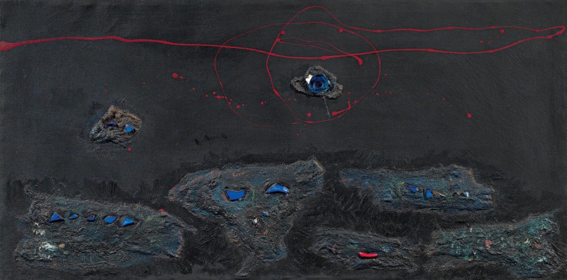 Enrico Baj Milano 1924 - Vergiate (Va) 2003 Senza titolo, 1956 Olio e collage di ovatta e vetri colorati su tela, cm. 59,6x120 Firma e data al verso sulla tela: Baj 56. Certificato su foto di Roberta Cerini Baj in data 28.01.2008, con n. 308.B. Esposizioni: Firenze-New York. Rinascimento e Modernità. Da Luca Signorelli a Andy Warhol, Firenze, Galleria d'Arte Frediano Farsetti, 30 settembre - 10 dicembre 2011, cat. n. 29, illustrato a colori.