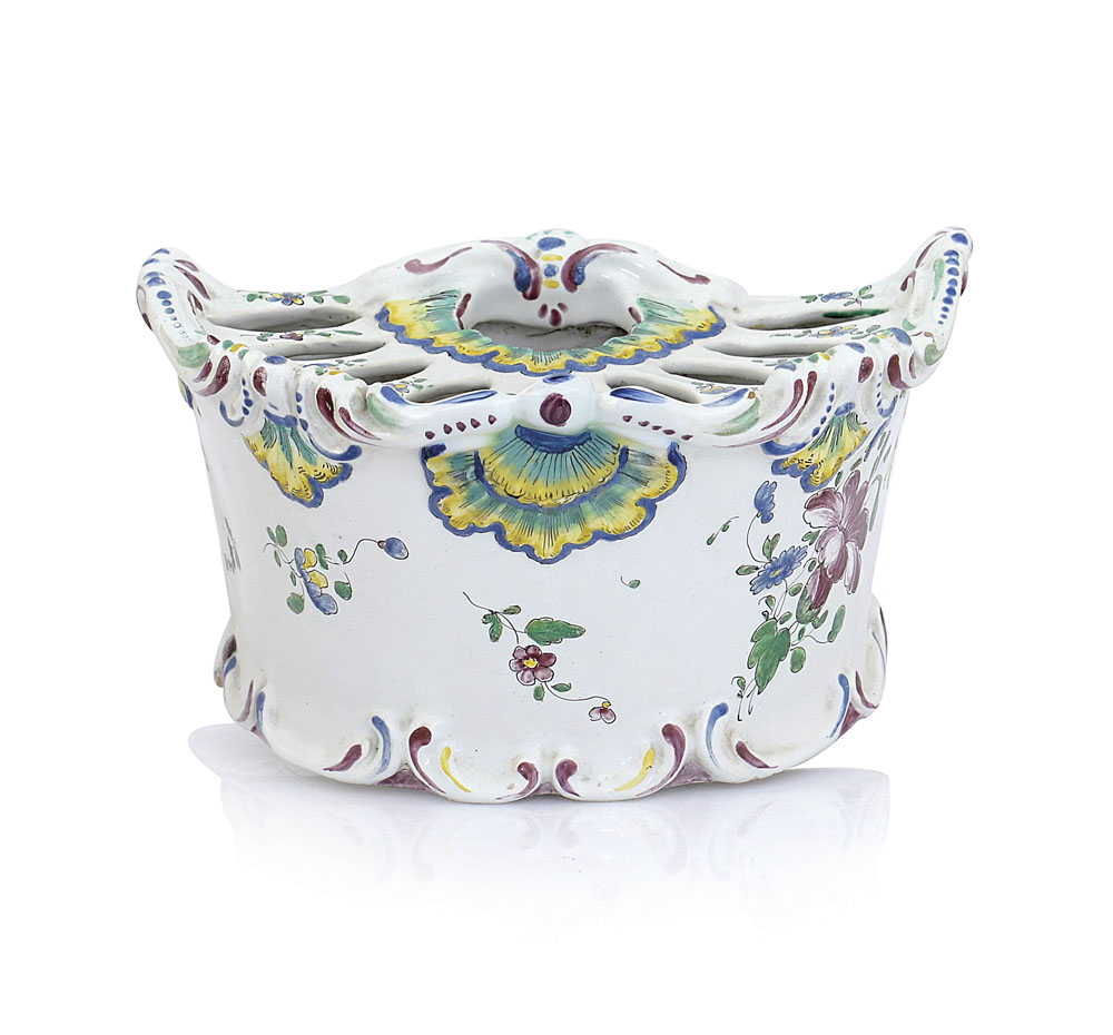 FIORIERA IN MAIOLICA, PROBABILMENTE MILANO, P.RUBATI, XVIII SECOLO, a mezzaluna, scanalata e sagomata a volute e conchiglie, parte superiore forata, decoro policromo a fiori.