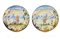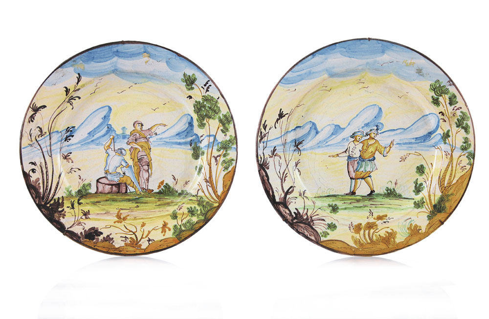 COPPIA DI PIATTI IN MAIOLICA, PAVIA, PRIMA META' XVIII SECOLO, decoro policromo con figure entro paesaggio; lievi difetti.