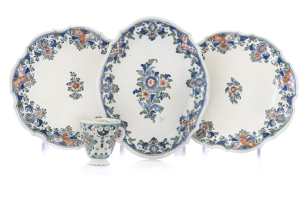 LODI UN PIATTO OVALE, DUE PIATTI E UNA TAZZA IN MAIOLICA, LODI, G.G.ROSSETTI, 1730 CA., mistilineo, decoro policromo a fiori orientali "alla Rouen", tazza con marca "GR"; due piatti e tazza restaurati.Cm 27x21, diam. 24 e alt. 7,5.