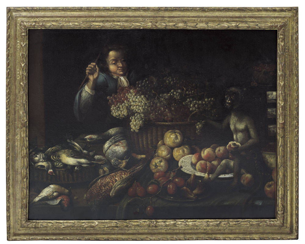 Natura morta con frutta, figura e scimmia