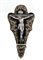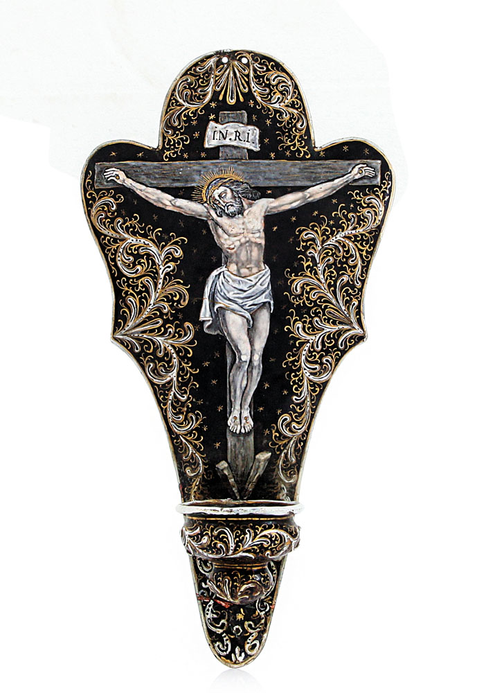 ACQUASANTIERA IN RAME E SMALTI POLICROMI, LIMOGES, XIX SECOLO, sagomata con Crocefisso e volute con profili in oro; danni e mancanze.