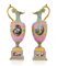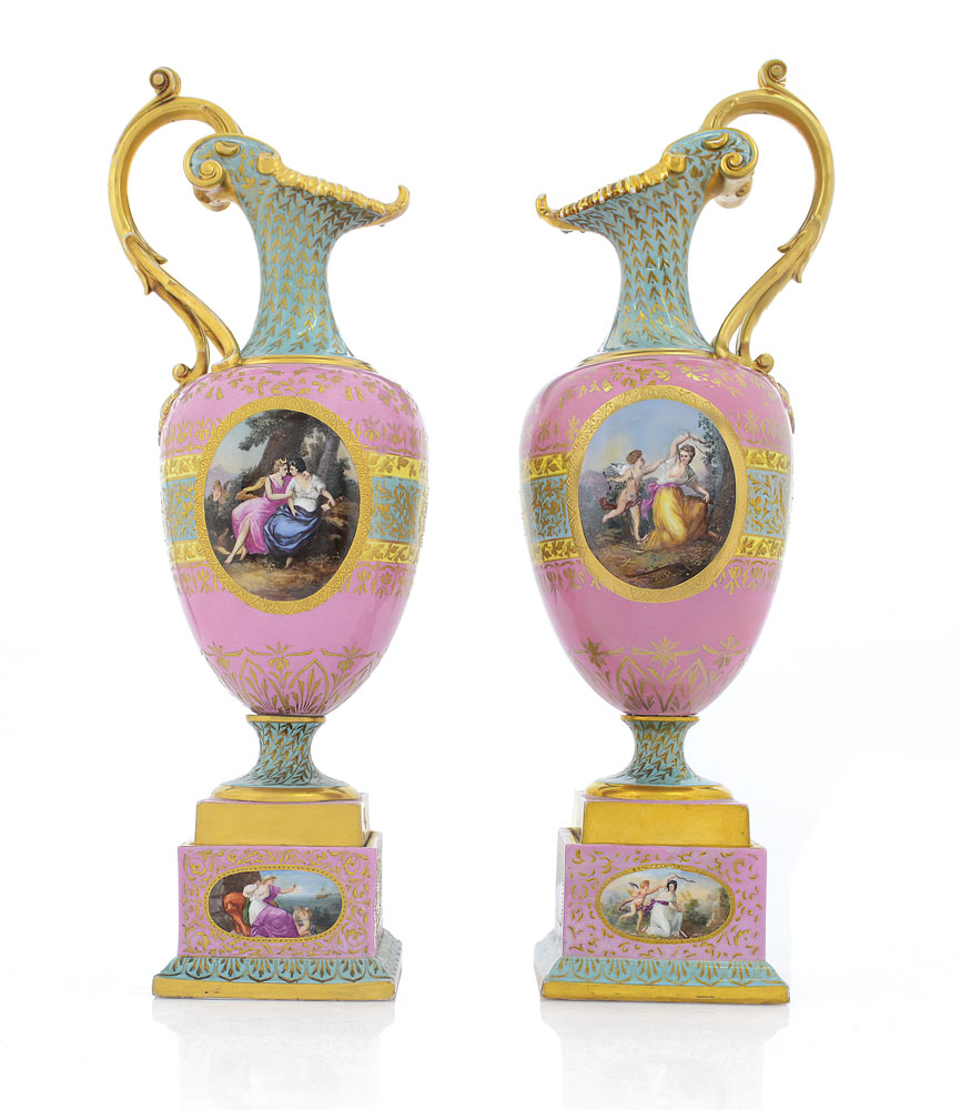 COPPIA DI GRANDI VASI IN PORCELLANA, VIENNA, XIX SECOLO, ad anfora con ansa fitomorfa su basi a plinto, corpo con doppie riserve ovali in oro e decoro policromo a scene mitologiche su fondo rosa, estese dorature e greche a motivi fogliati; lievi usure e uno con restauro.