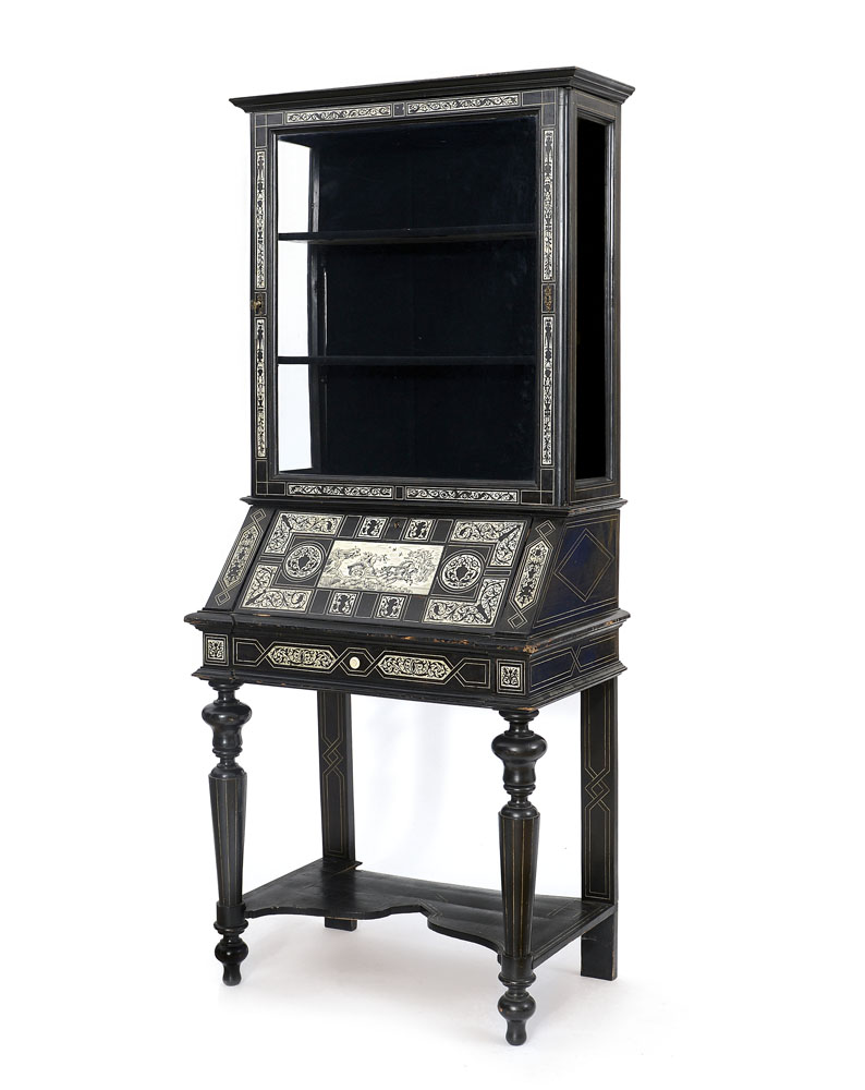 PICCOLO CASSETTONE A RIBALTA CON VETRINA INTARSIATO IN AVORIO, MILANO, 1860 CA., AMBITO DI FERDINANDO POGLIANI, a due corpi con calatoia celante cassettini e vani, sopralzo ad un'anta a vetri, decoro a girali fitomorfe con grande placca frontale in avorio decorata con il carro dell'Aurora, da Guercino; difetti, usure e sbeccature.