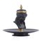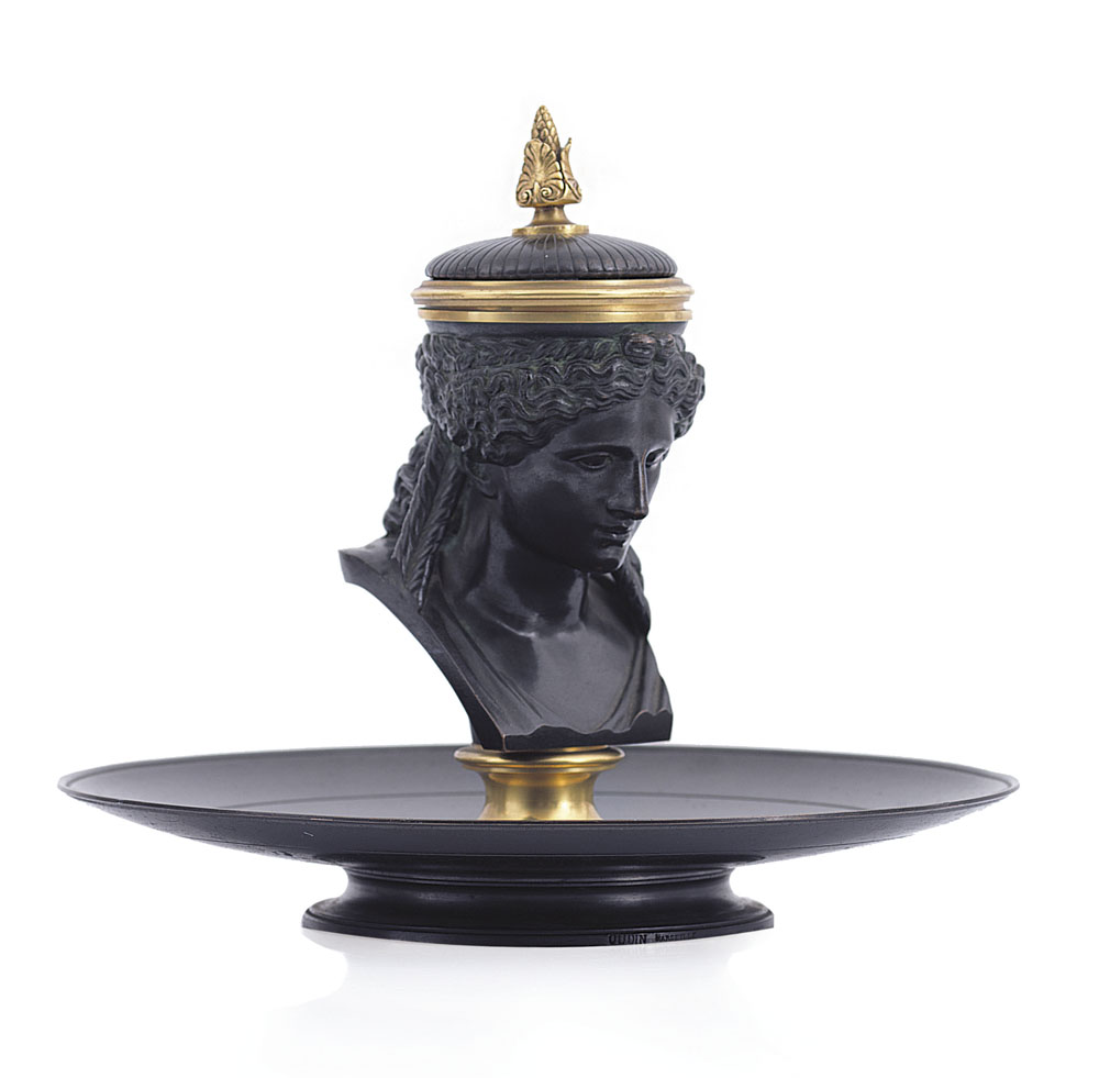 CALAMAIO IMPERO IN BRONZO PATINATO E DORATO, OUDIN A MARSEILLE, XIX SECOLO, con busto femminile cimato da coperchio incernierato su piatto circolare scanalato; firma, località e marchio "I Oudry & Co. Fres Etiteurs" impressi