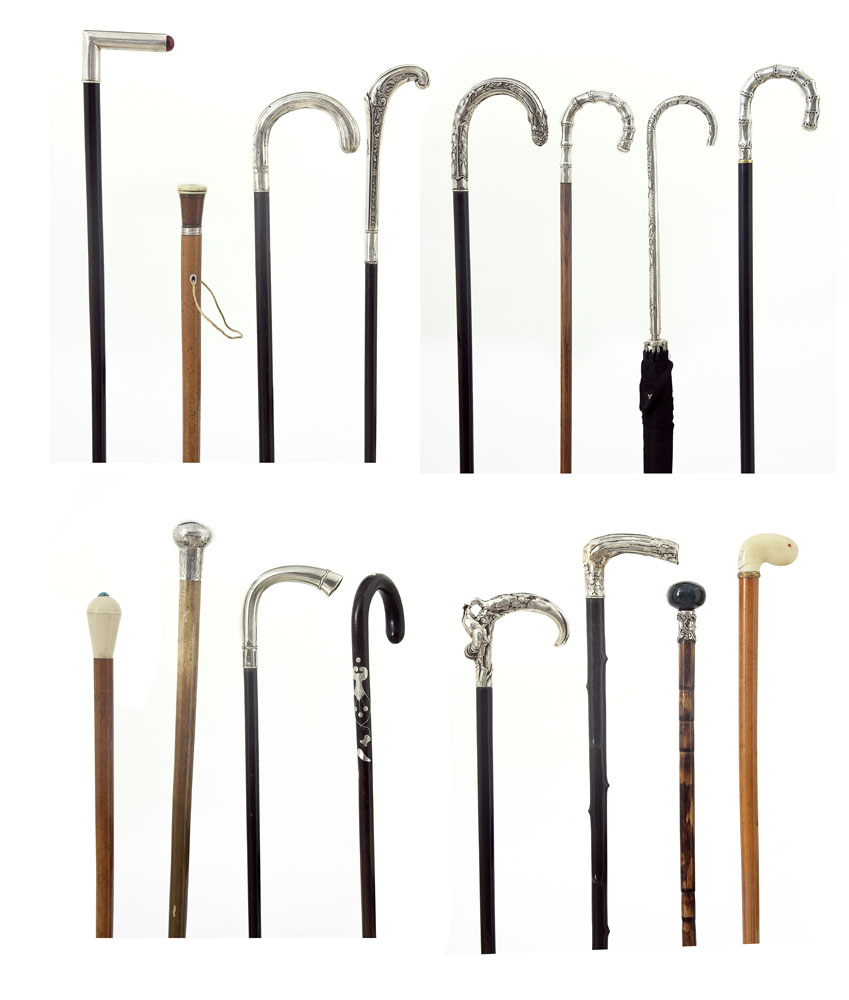 LOTTO DI QUINDICI BASTONI DA PASSEGGIO E UN OMBRELLO, XIX-XX SECOLO, con differenti impugnature e fogge tra cui due in avorio e alcuni in argento; qualche mancanza e difetti.