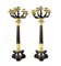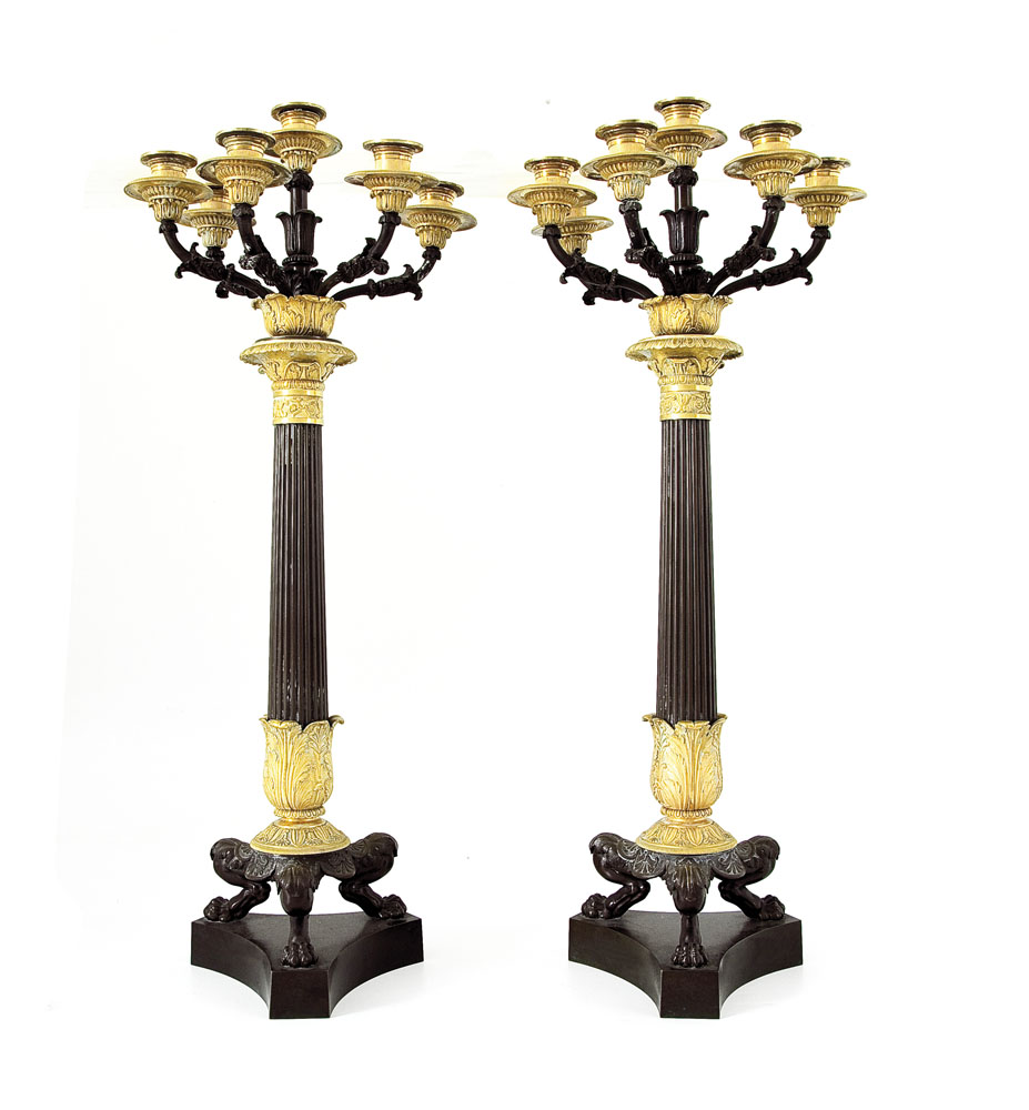 COPPIA DI GRANDI CANDELABRI IN BRONZO DORATO E BRUNITO, XIX SECOLO, a sei fiamme con bracci a foglie d'acanto, fusto scanalato su tre gambe ferine con basamento.