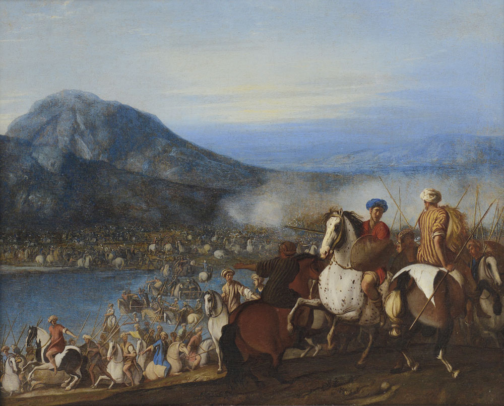 FALCONE ANIELLO Napoli 1607 - 1656Cavalieri che guadano un fiumeOlio su tela,...
