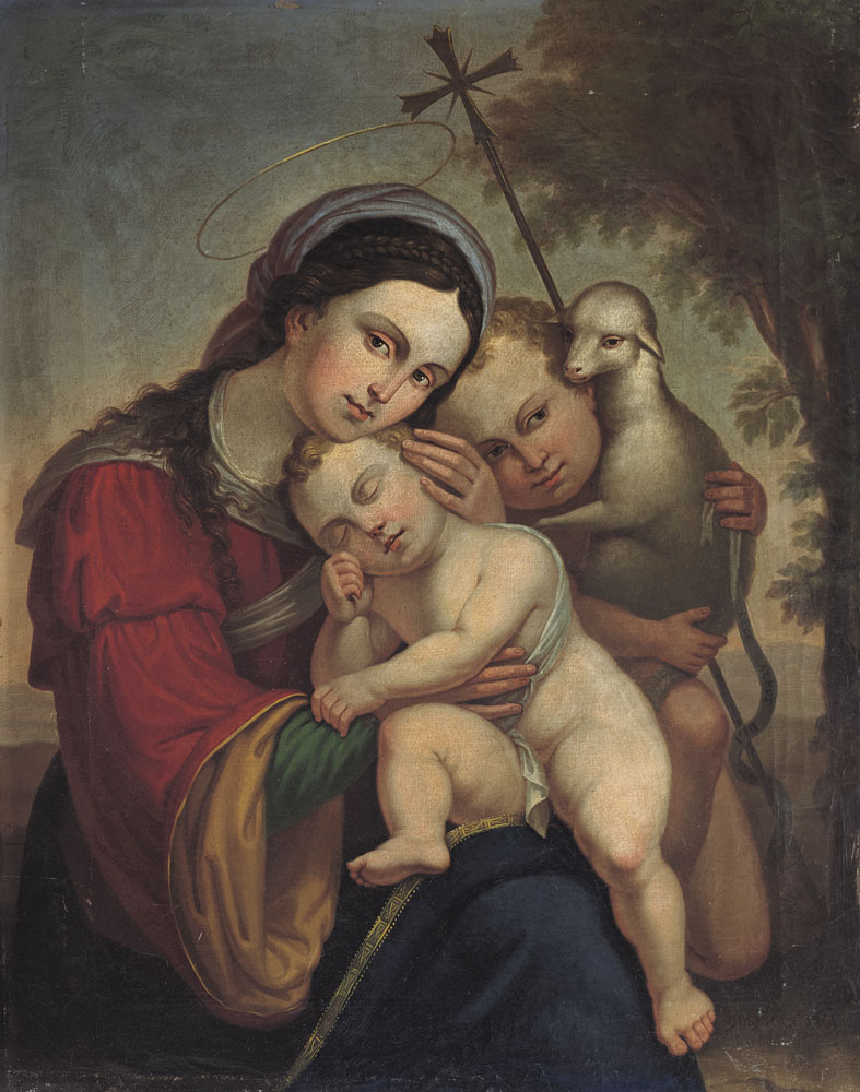 PITTORE DEL XIX SECOLO Madonna con Bambino e San Giovannino Olio su tela, cm...