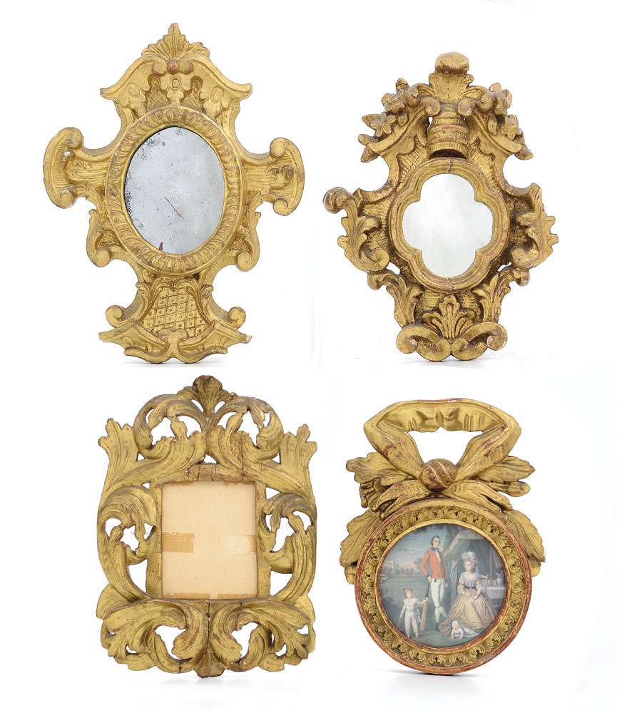 LOTTO DI QUATTRO CORNICI IN LEGNO SCOLPITO E DORATO, XVIII-XIX SECOLO, due contenenti specchi; restauri, mancanze e usure.