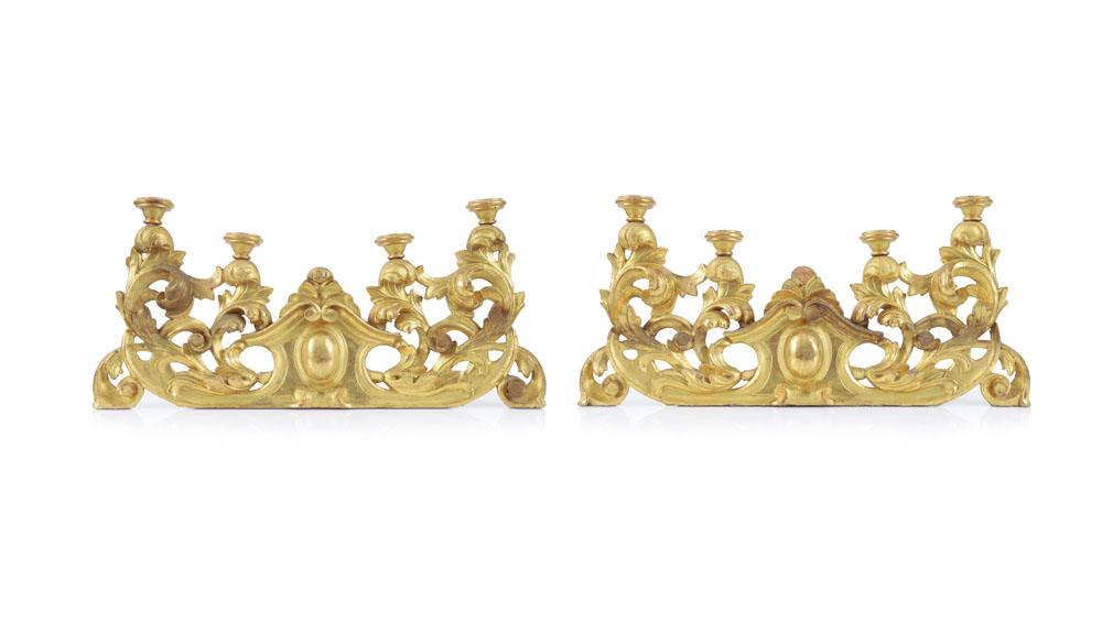 COPPIA DI FREGI IN LEGNO SCOLPITO E DORATO, XIX SECOLO, a volute contrapposte con quattro porta ceri; sbeccature e rincolli.