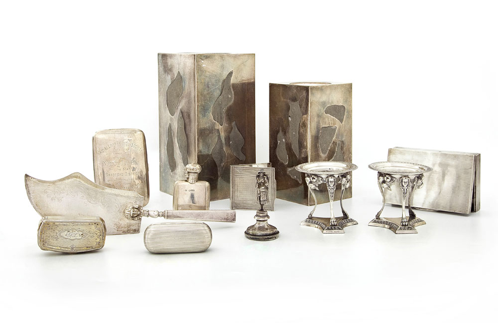 LOTTO DI DIVERSI OGGETTI IN ARGENTO, XX SECOLO, composto da cinque scatole diverse, una fiaschetta, un porta stecchini, due saliere in stile impero (mancanti di cristallo), due vasi zavorrati a parallelepipedo e una paletta; usure.
