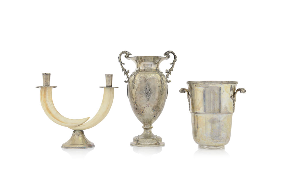 LOTTO DI OGGETTI IN ARGENTO, XX SECOLO, composto da un vaso con doppio manico, un secchiello porta ghiaccio con manici e un candelabro con denti di facocero su base in argento; difetti.