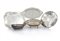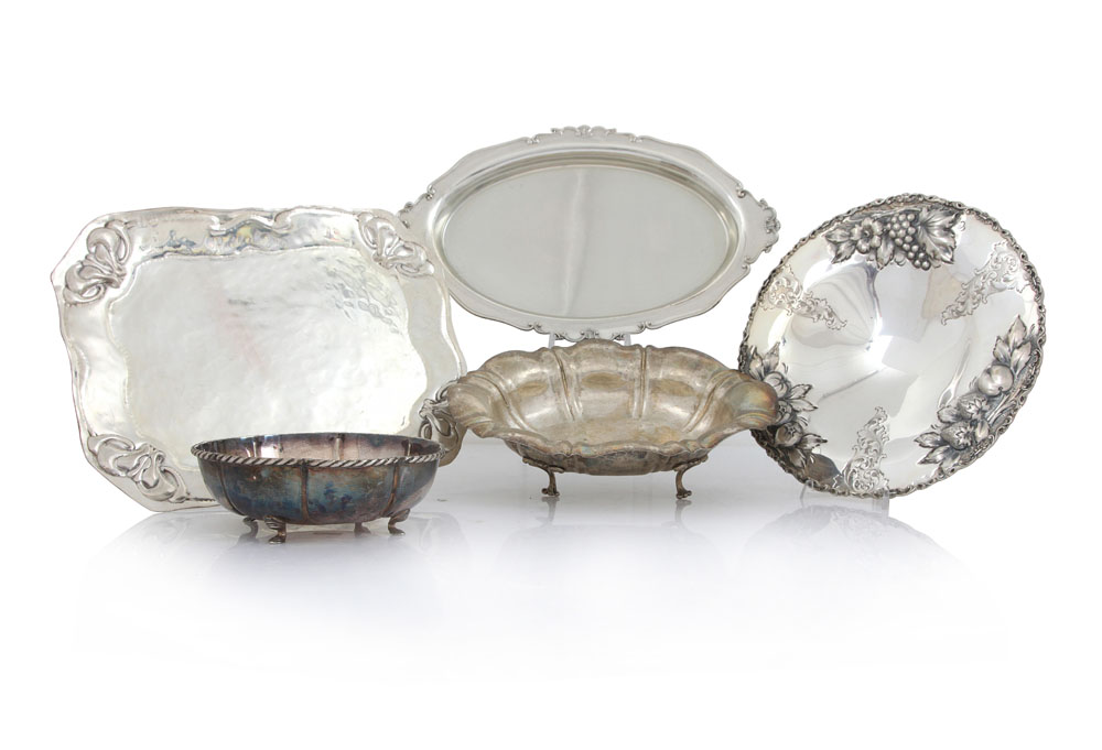 LOTTO DI DIVERSI OGGETTI IN ARGENTO, XX SECOLO, composto tre diversi centrotavola su piedini e due vassoi; sbalzi e decori differenti; usure.