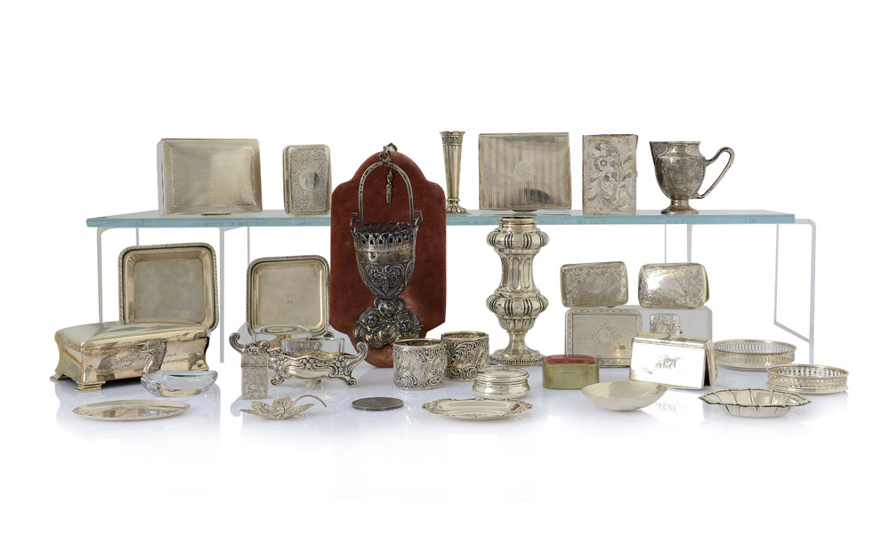 LOTTO DI DIVERSI OGGETTI IN ARGENTO, XIX-XX SECOLO, composto da un'acquasantiera con secchiello, un vasetto, tre cofanetti portagioie, sei tabacchiere, due porta cerini, due portatovaglioli, una coppia di saliere con vetro, otto diversi piattini, una lattierina, una bomboniera, una medaglia francese e tre piccoli oggetti; lievi ammaccature.