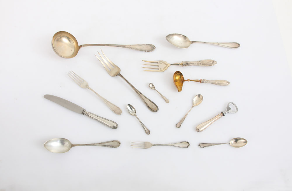 SERVIZIO DI POSATE IN ARGENTO, CALDERONI, MILANO, XX SECOLO, composto da dodici forchette e cucchiai, undici coltelli, sei forchettine da dessert, sette cucchiaini da té, un mestolo e due posate da portata, unito a NOVE CUCCHIAINI, DUE POSATE ED UN CAVATAPPI IN ARGENTO, XX SECOLO, di produzioni diverse; (tot. pz. 63); difetti e usure.