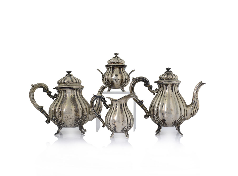 SERVIZIO DA TE E CAFFE' IN ARGENTO, ANNI '40, PUNZONI DEL FASCIO, composto da teiera, caffettiera, lattiera e zuccheriera con coperchio, costolati con presa a fiore.