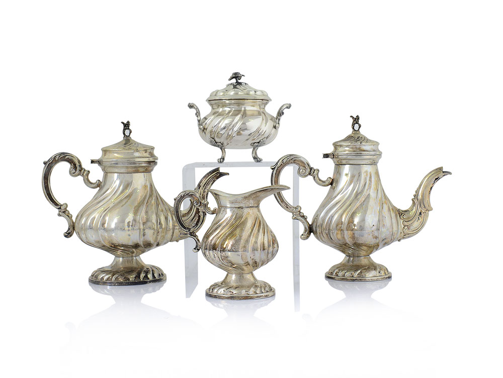 SERVIZIO DA TE E CAFFE' IN ARGENTO, XX SECOLO, composto da teiera, caffettiera e lattiera uniti a una zuccheriera con coperchio di simile decoro, corpi piriformi costolati su basi circolari.