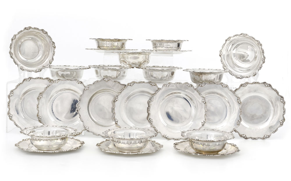DODICI BOWLS CON PIATTO IN ARGENTO, XX SECOLO, lisce con bordi mistilinei a volute.