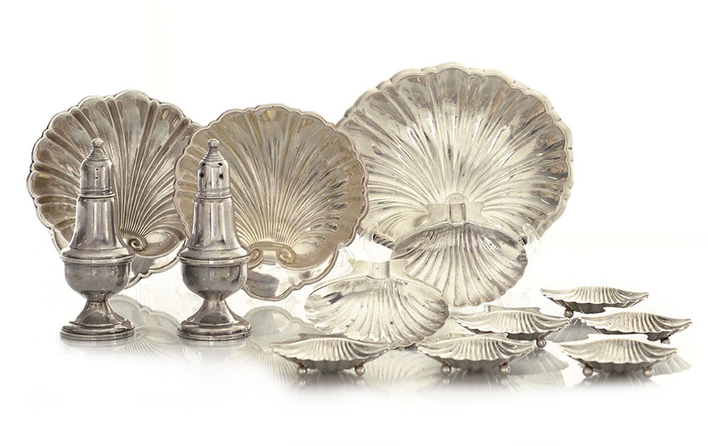 LOTTO DI DIVERSI OGGETTI IN ARGENTO, XX SECOLO, composto da una ciotola a conchiglia, Gorham, otto diverse piccole conchiglie, due posacenere a conchiglia diversi e una coppia di salini zavorrati; difetti.