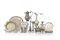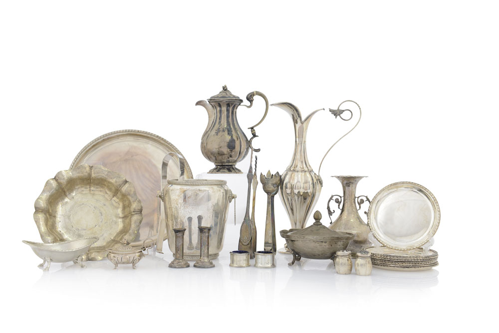 LOTTO DI DIVERSI OGGETTI IN ARGENTO, XX SECOLO, composto da un secchiello portaghiaccio con manici, otto sottobicchieri, un piatto, una ciotola polilobata, tre pinze diverse (una in metallo), una zuccheriera con coperchio non punzonata, una caffettiera in stile antico, un vasetto a due manici, un vaso, una zuccheriera ovale, una piccola saliera con vetro interno, due coppie di salierine di cui una coppia con vetro blu e due portacandela danneggiati; difetti e ammaccature
