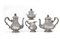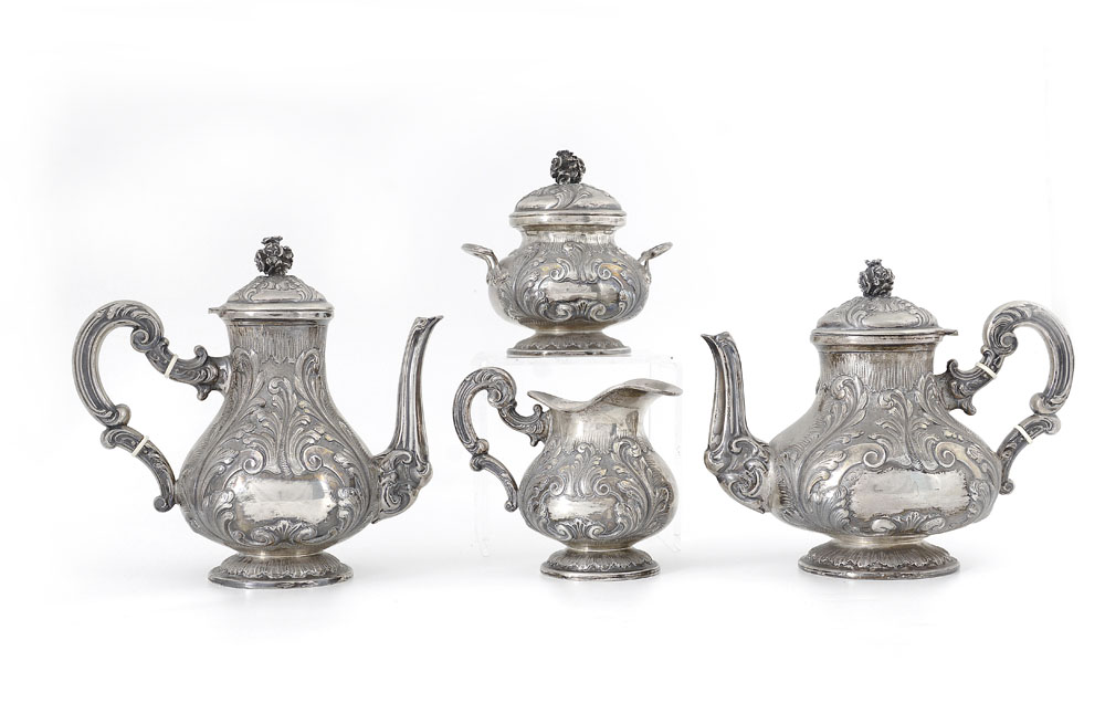 SERVIZIO DA TE E CAFFE IN ARGENTO, XX SECOLO, composto da teiera, caffettiera, lattiera e zuccheriera con coperchio, decori a volute fogliacee e prese a mazzetti floreali.