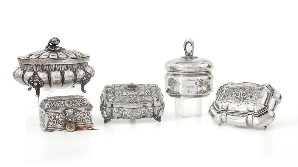 ARGENTI D'EPOCA CINQUE DIVERSI COFANETTI IN ARGENTO, XX SECOLO, di diversa...