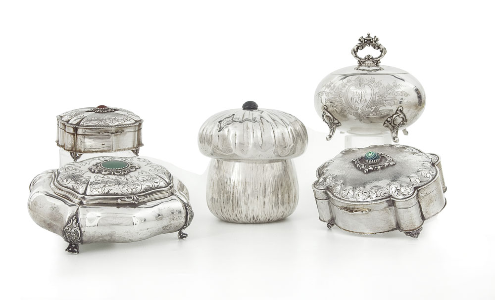ARGENTI D'EPOCA CINQUE DIVERSI COFANETTI IN ARGENTO, XX SECOLO, di diversa...
