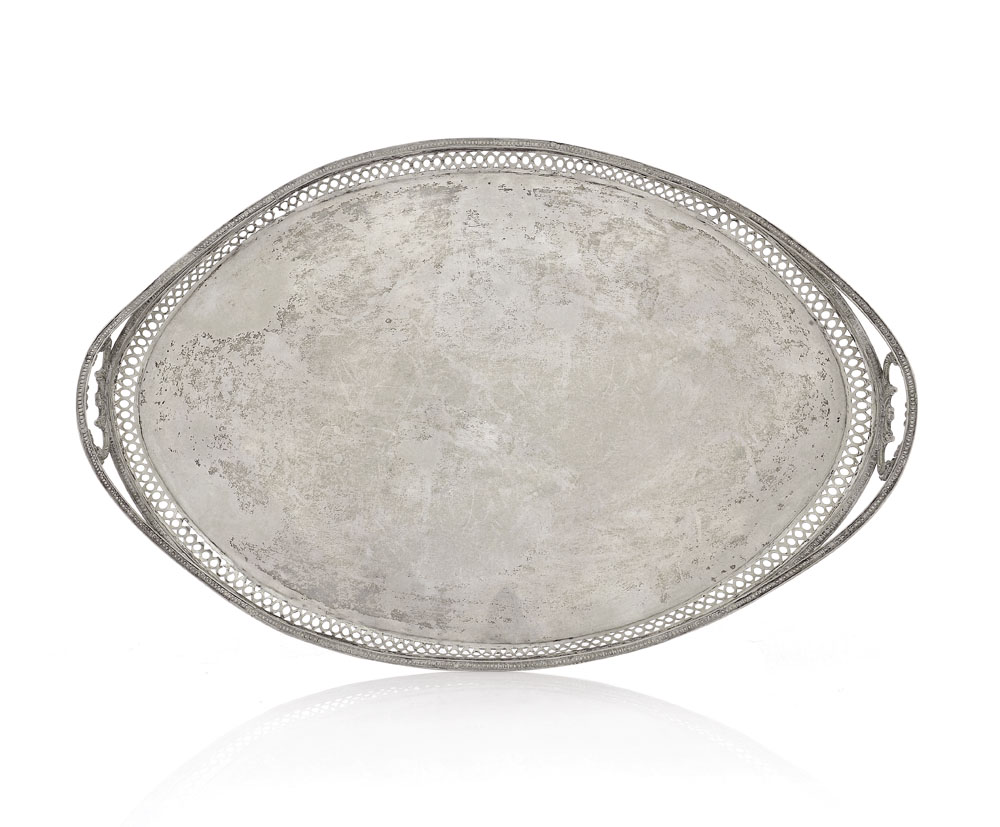 VASSOIO IN ARGENTO, XIX SECOLO, ovale con manici e bordo traforato a ovoli; difetti; apparentemente non punzonato.