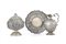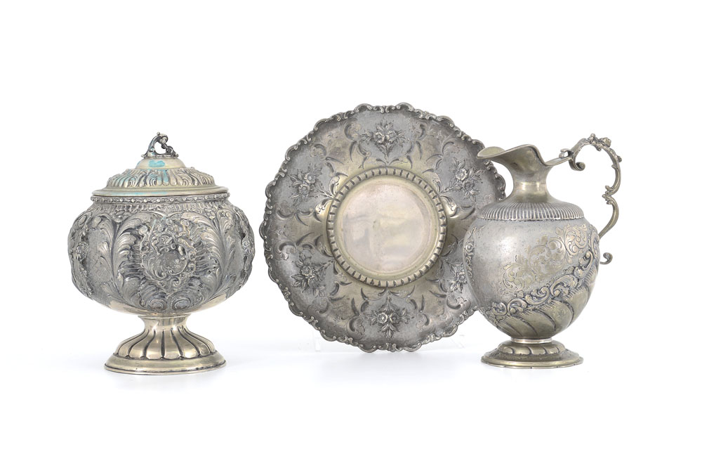UN VERSATOIO CON PIATTO E UNA COPPA CON COPERCHIO IN ARGENTO, XX SECOLO, decori floreali incisi e sbalzati con parti satinate; coperchio probabilmente adattato.