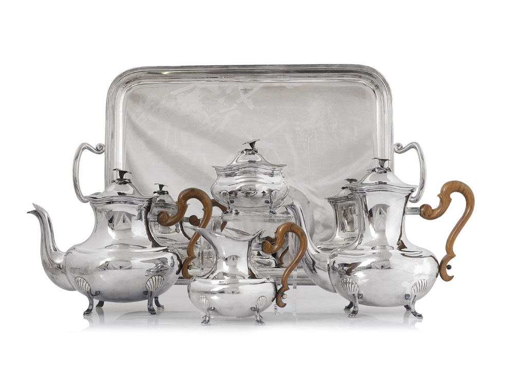 SERVIZIO DA TE E CAFFE' IN ARGENTO, ALESSANDRIA, CESA, XX SECOLO, composto da teiera, caffettiera, lattiera, zuccheriera con coperchio e vassoio a due manici, manici in legno e prese a fiore.