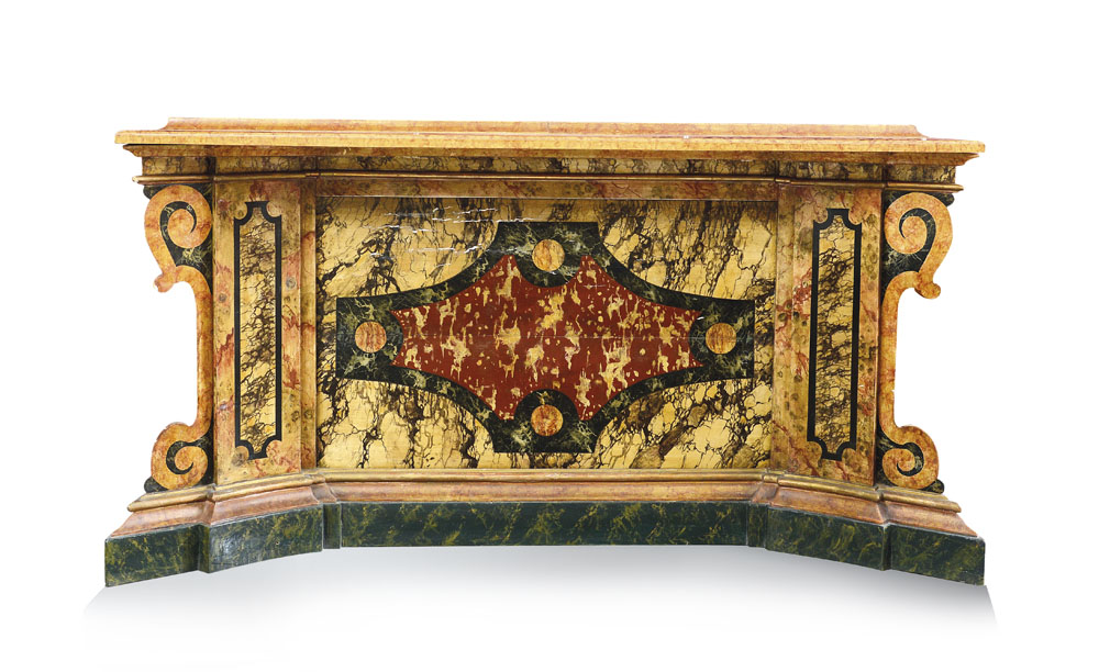 CONSOLE IN LEGNO DIPINTO, XIX SECOLO, decori a finto marmo; difetti, sbeccature e restauri.