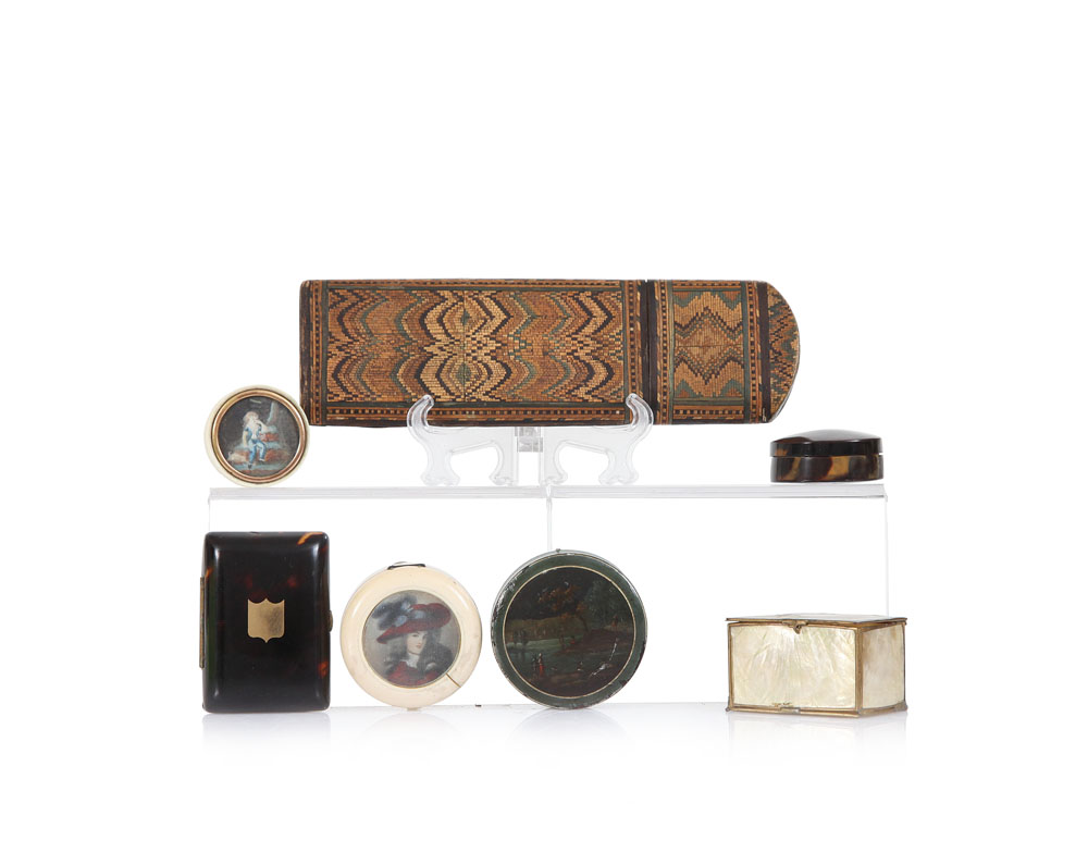 LOTTO DI SCATOLE E COFANETTI IN MATERIALI VARI, XIX-XX SECOLO, composto da due scatole in tartaruga, due scatole in avorio con miniatura, una scatola in papier maché dipinta, una scatola in madreperla e un astuccio intarsiato in paglia; difetti e mancanze.