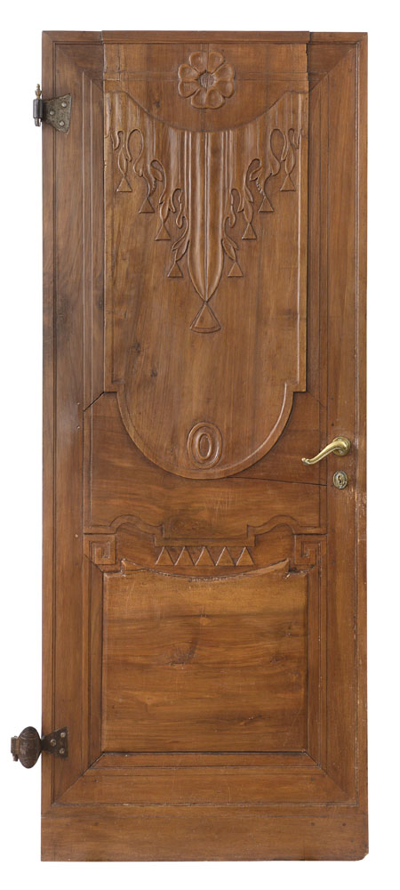 PORTA IN NOCE, XVIII SECOLO, scolpita con rosetta e festoni a bassorilievo; usure.