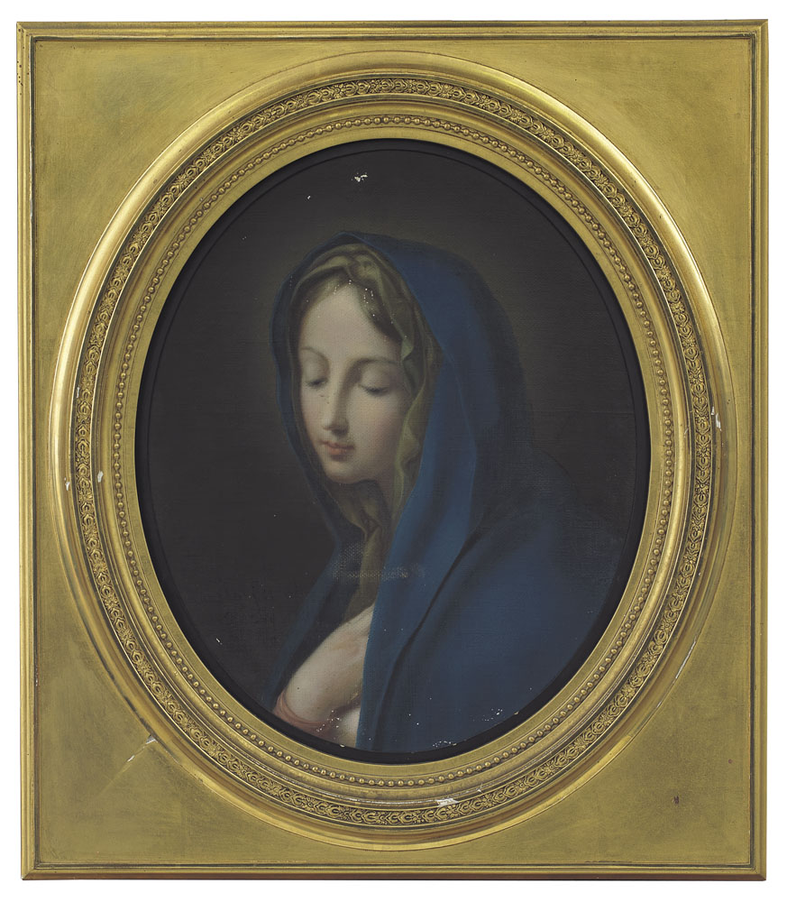 PITTORE DEL XIX SECOLO Volto della VergineOlio su tela ovale applicata su...