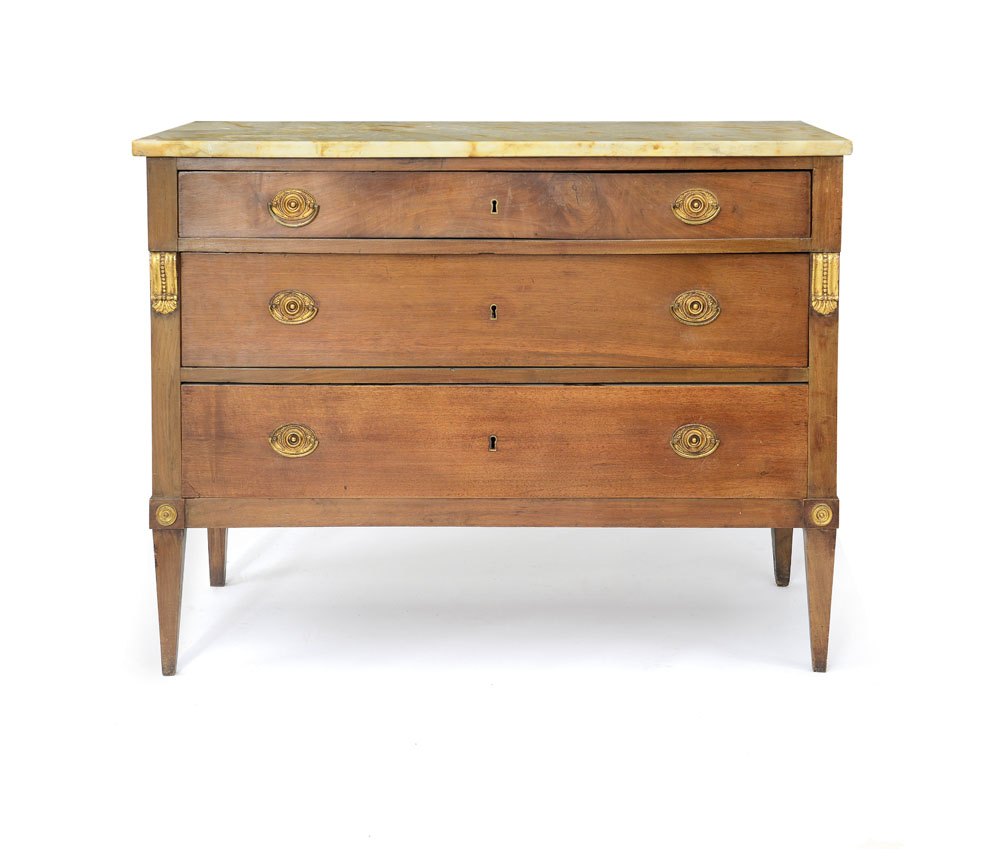 CASSETTONE IN NOCE, FINE XVIII SECOLO, fronte a tre cassetti, montanti con voluta intagliata e dorata, gambe ad obelisco rovesciato, piano in marmo d'epoca successiva; difetti e usure.