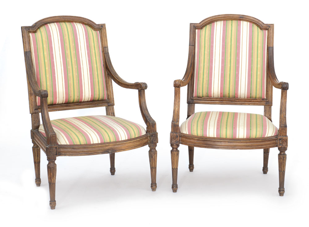 COPPIA DI POLTRONE LUIGI XVI IN NOCE, PIEMONTE, XVIII SECOLO, schienale e seduta imbottite, gambe rastremate; sbeccature e usure.