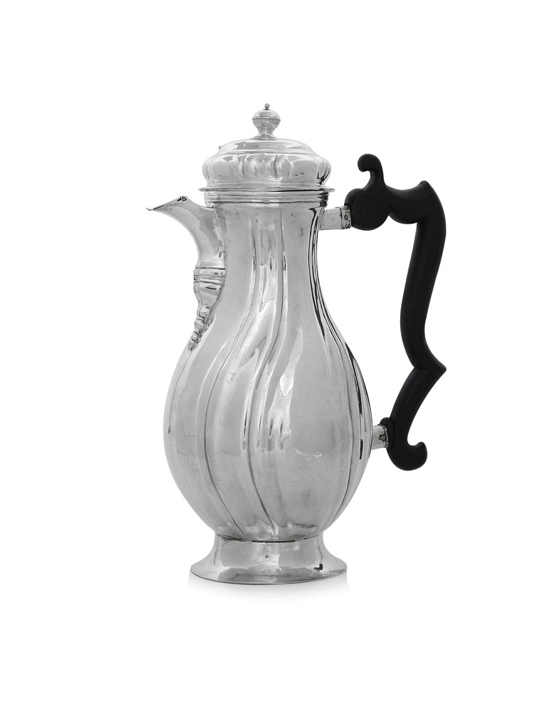 GRANDE CIOCCOLATIERA IN ARGENTO, GERMANIA, CITTA' DI AUGSBURG, 1750 CA., ARGENTIERE C. EUGELBRECHT, piriforme a costolature ondulate, manico in legno ebanizzato, coperchio incernierato, versatore con placchetta di chiusura incernierata, base circolare; pomolo bloccato.