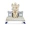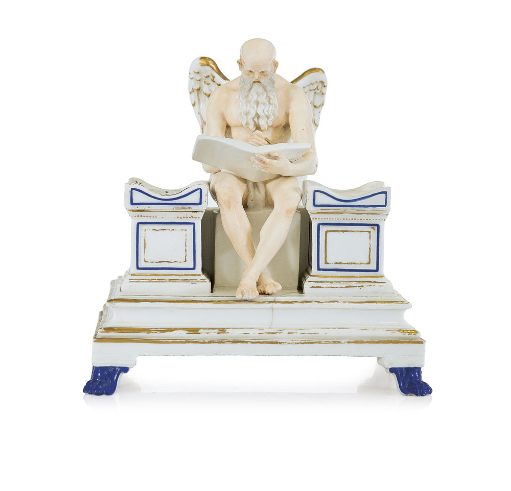 CALAMAIO IN PORCELLANA, F.TAGLIOLINI, NAPOLI, REAL FABBRICA FERDINANDEA, 1800 CA., a base rettangolare sormontata da figura di Kronos e doppio vasetto a plinto; marca "N" in blu coronata; fessure e usure.