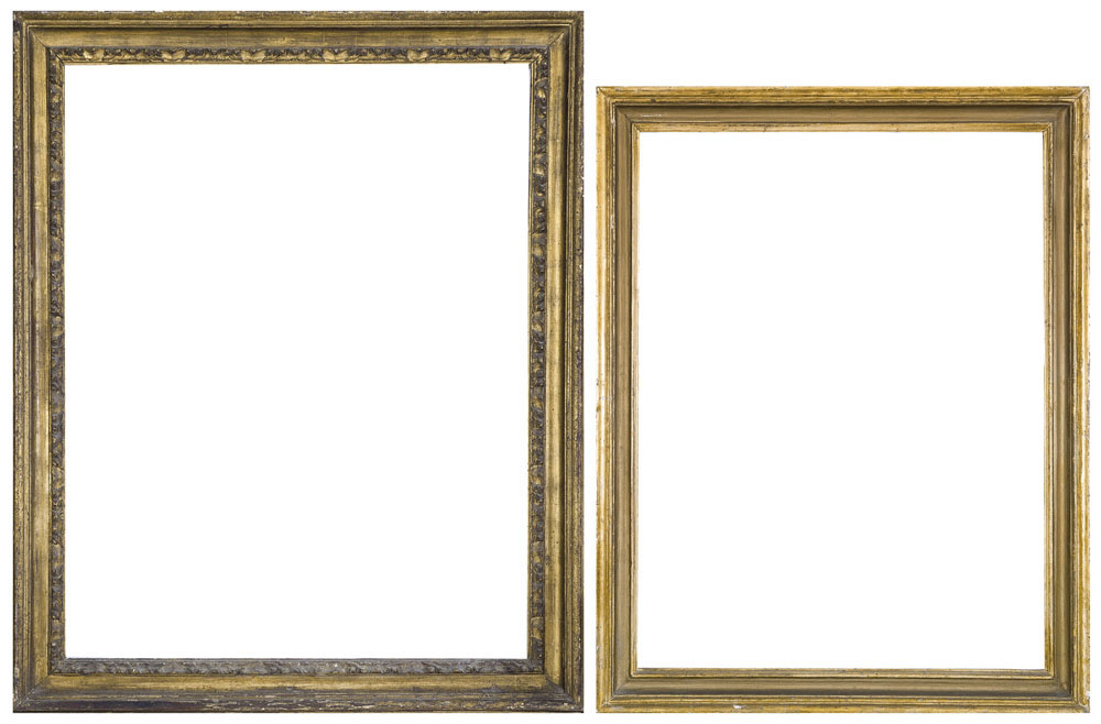 DUE CORNICI IN LEGNO SCOLPITO E DORATO, XVIII SECOLO, una modello Salvator Rosa e una a doppio ordine; usure e restauri.