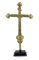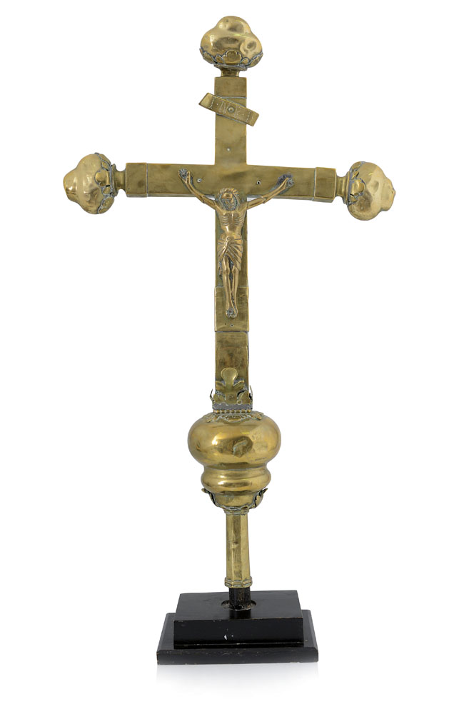 GRANDE CROCE DA PROCESSIONE CON CRISTO IN METALLO, XVI-XVII SECOLO, Cristo coronato con costato profondamente marcato, croce con estremità piriformi e motivi fogliati, base in legno ebanizzato; mancanze, restauri e difetti.