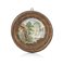 PIATTELLO IN MAIOLICA, CASTELLI, BOTTEGA DEI GRUE, XVIII SECOLO, circolare con decoro a paesaggio con rovine e figure; entro cornice coeva in legno scolpito e dorato con usure e lievi sbeccature.