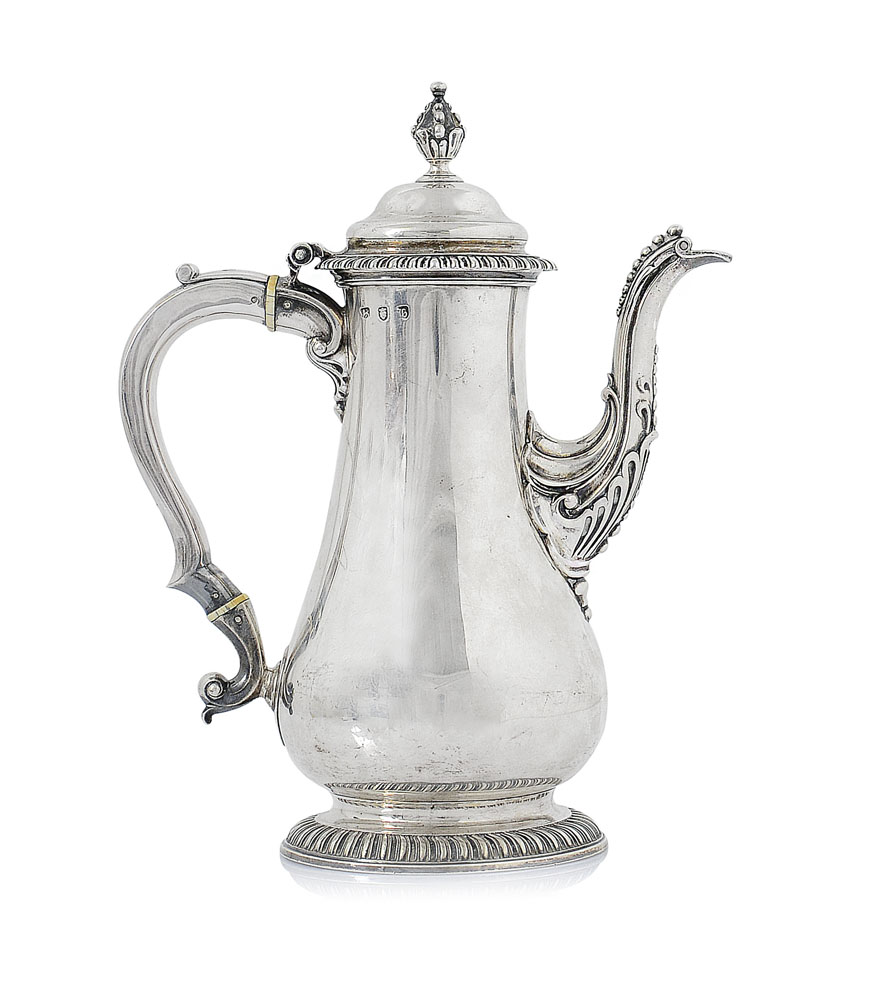 CAFFETTIERA GIORGIO III IN ARGENTO, LONDRA, 1763, ARGENTIERE F.WHITE, piriforme liscia con bordi godronati e manico a voluta, monogramma entro cartiglio inciso.